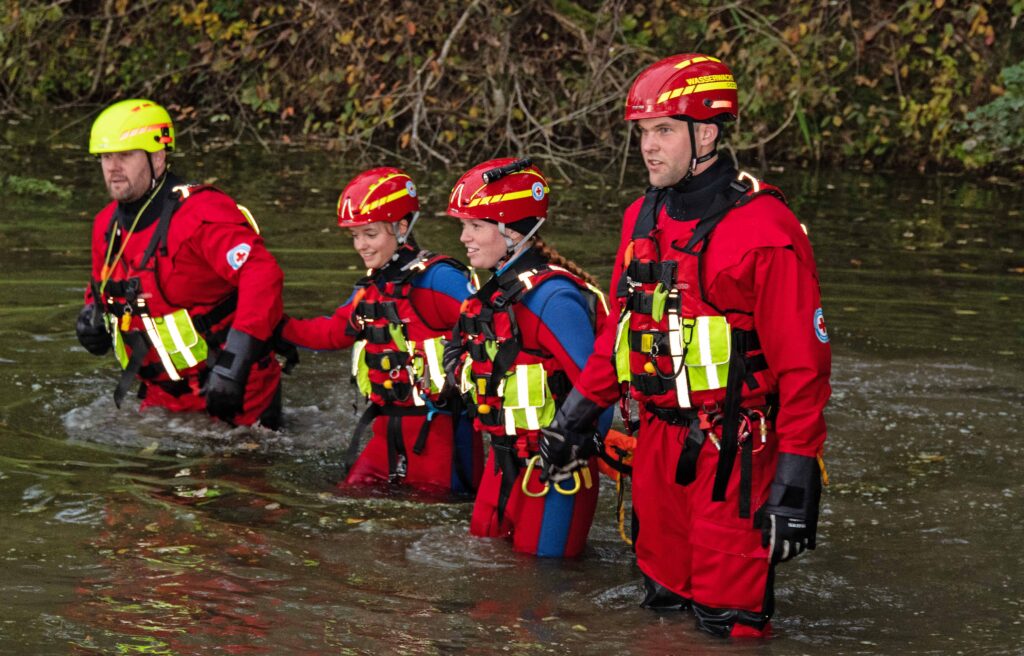 Wasserretter in Formation suchen nach der vermissten Person im Wasser.